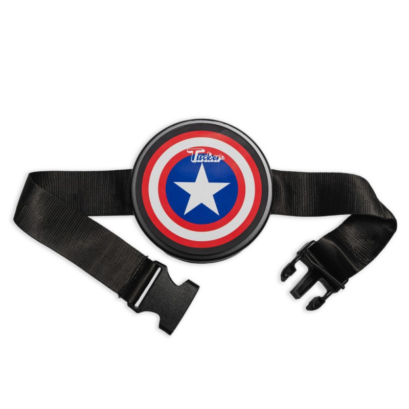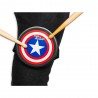 Pad de práctica portátil diseñado para colocarse sobre las piernas. Tiene un diseño compacto con una superficie circular de aproximadamente 12 cm, decorado con un patrón de estilo "escudo". Incluye correas ajustables para asegurar el pad a las piernas, permitiendo practicar cómodamente en cualquier lugar. Ideal para bateristas en movimiento.